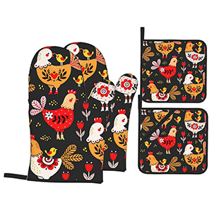 4-delige keukenset. 2 geïsoleerde handschoenen en 2 onderleggers gemaakt van waterdichte polyester en warmte isolerende stof.
